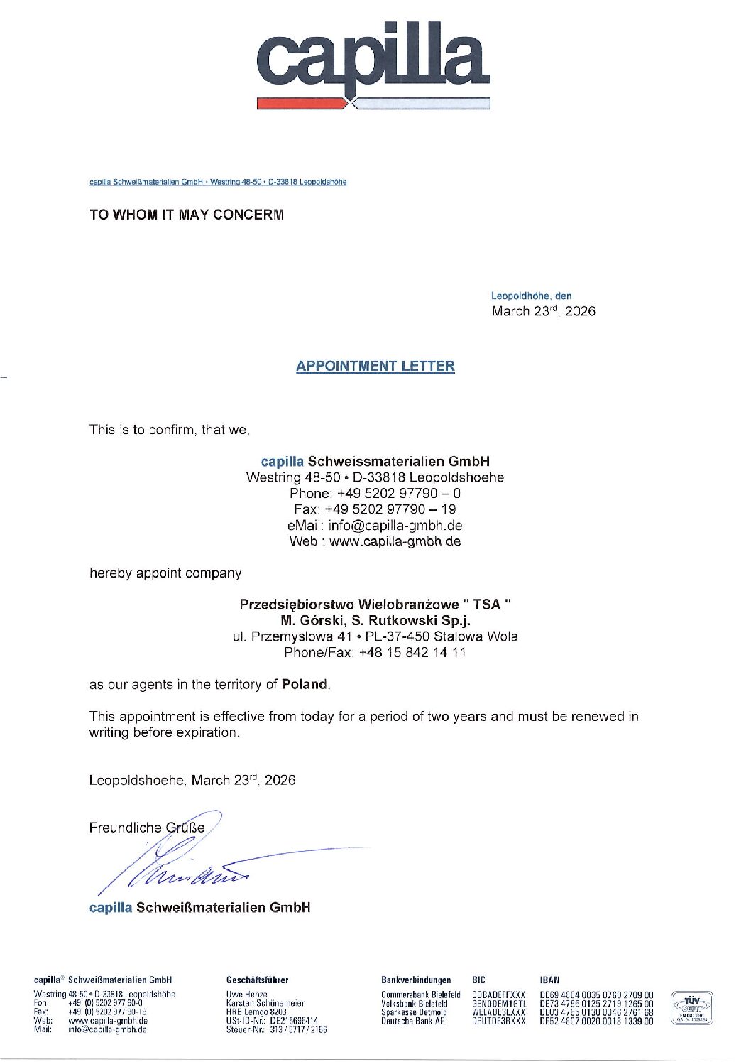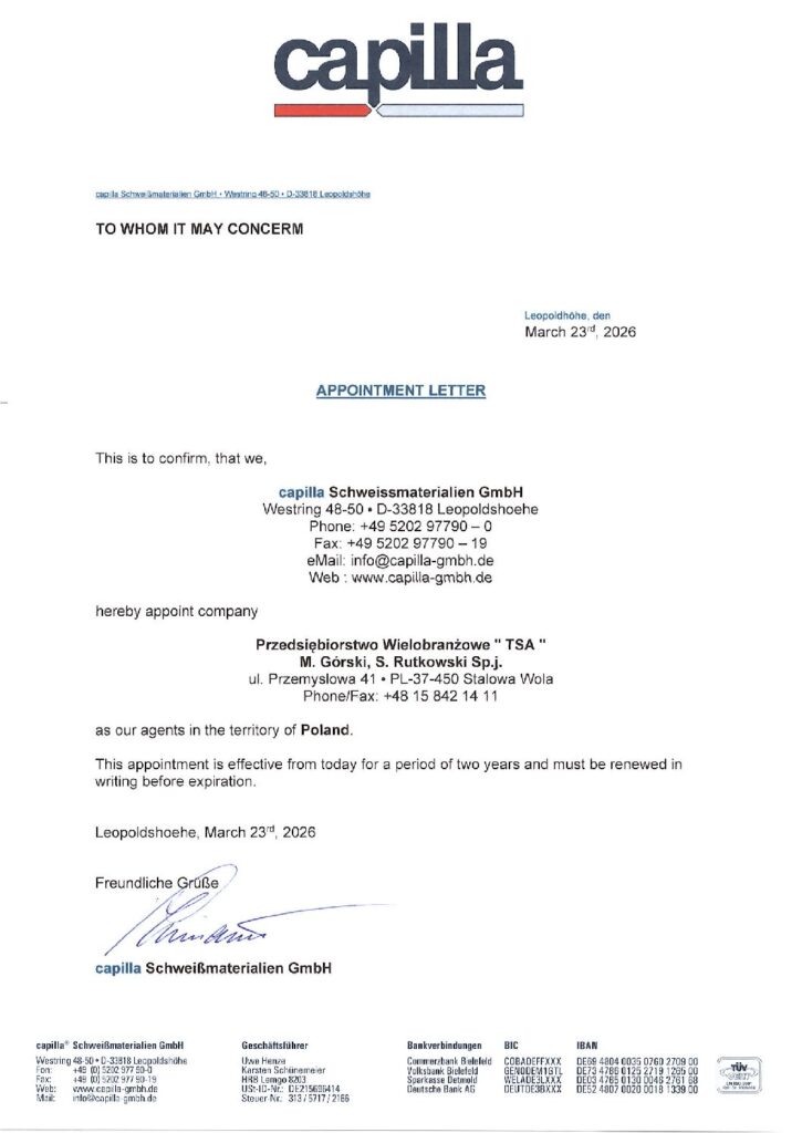 Jesteśmy wyłącznym przedstawicielem na Polskę niemieckiej firmy Capilla oferującej profesjonalne materiały spawalnicze, m.in. na bazie kobaltu, niklu, żelaza, węglików wolframu oraz specjalnych stopów. O renomie firmy Capilla świadczy chociażby fakt ponad 50 lat kompetencji w spawaniu na całym świecie z ciągle rosnącymi udziałami w rynku, a także współpracą z dużymi i średnimi przedsiębiorstwami w niemal wszystkich gałęziach przemysłu obróbki metali. Ponadto Capilla posiada certyfikat ISO 9001 przyznany przez koncern TÜV NORD oraz inne liczne przedstawicielstwa na całym świecie, które troszczą się o to, aby standard produktów przez nią oferowanych pozostawał zawsze na najwyższym poziomie.   Dzięki zastosowaniu produktów i technologii Capilla możemy w sposób szybki i oszczędny dokonać napraw oraz regeneracji części maszyn i urządzeń, a także zabezpieczyć je prewencyjnie z użyciem technologii spawalniczych przed szkodliwymi dla nich zjawiskami różnego rodzaju zużycia, tj.: ścieranie, erozja, uderzenia czy tarcie. Ukierunkowani jesteśmy szczególnie na pomoc w odpowiednim doborze technologii naprawy lub zabezpieczenia części maszyn i urządzeń tak, aby zwiększyć ich żywotność oraz zapewnić maksymalną oszczędność kosztów związanych z przestojem produkcji i wymianą uszkodzonego elementu. Nasi Partnerzy to przede wszystkim zakłady produkcyjne, firmy projektowe i inżynieryjne, a w szczególności ich działy remontowe i utrzymania ruchu.   Oferujemy szeroki asortyment materiałów dodatkowych firmy Capilla, z których  dwie grupy to: